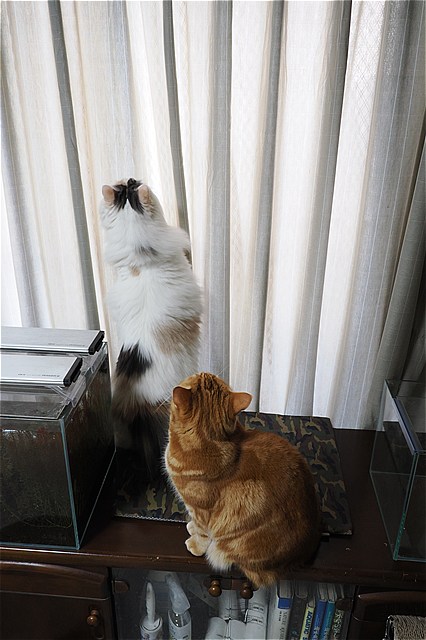 で、來依の方が飛びかかりましたが、さすがに小さなハエを捕獲するのは難しいのか、取り逃がしてしまいました。